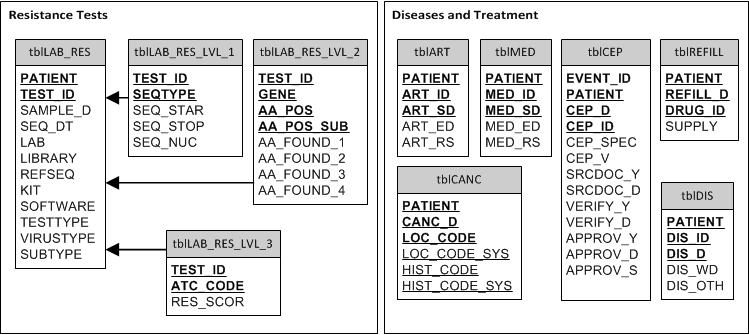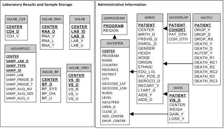 | tblBAS | holds basic information such as demographics, basic clinical information and date of AIDS diagnosis |